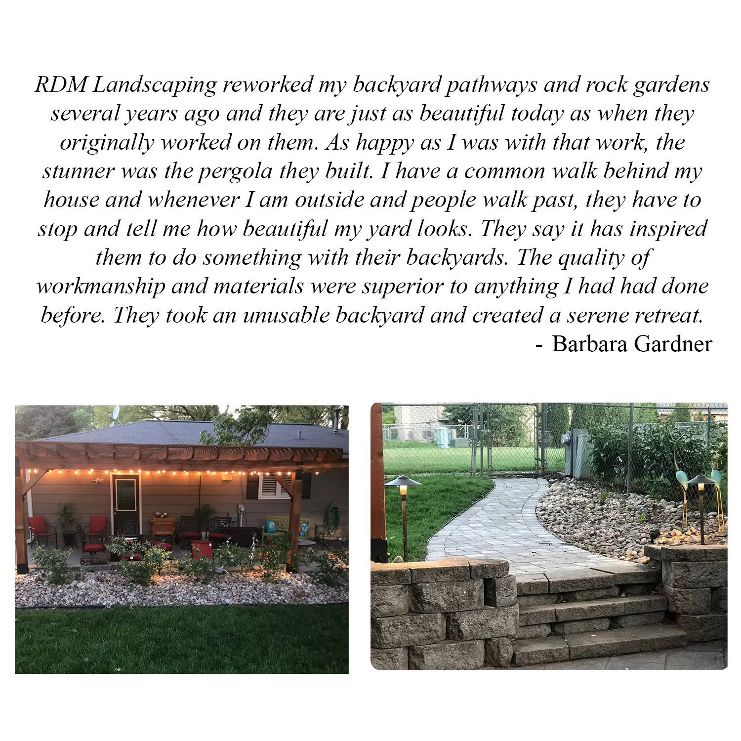 RDM Landscapes is a small owner operated general landscape company providing residential & commercial landscaping services for Lincoln and the surrounding communities. Whether you’re looking to add retaining walls, paver patios, fire pits or entire outdoor living areas, at RDM Landscapes we understand the importance of the homeowner’s needs and promise to keep you involved in your project every step of the way.